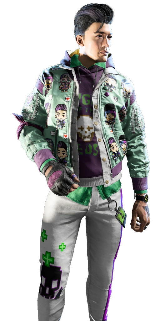 Jing powers up his style game in this posh, pixelated attire. |